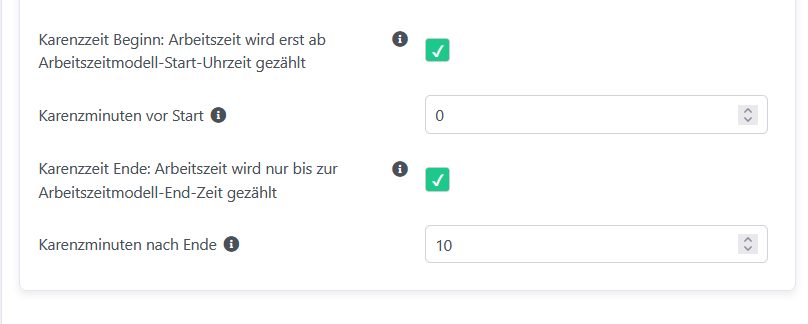 Haben Sie 0 eingetragen, greift die Karenzzeit nicht und die Zeit wird sofort erfasst, wenn der Mitarbeiter einstempelt. Dasselbe gilt auch für das Ende der Karenzzeit.