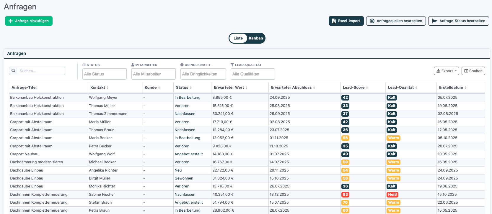 - Kanban-Board: Visuelle Darstellung in Spalten nach Status. Anfragen können per Drag & Drop zwischen den Spalten verschoben werden.