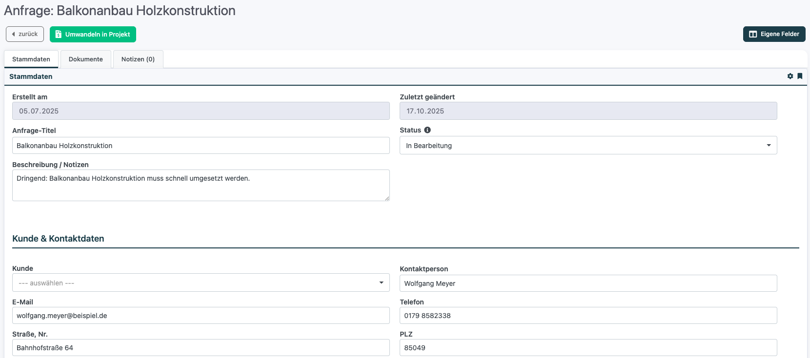- Projekt-Umwandlung: Gewonnene Anfragen können direkt in Projekte überführt werden