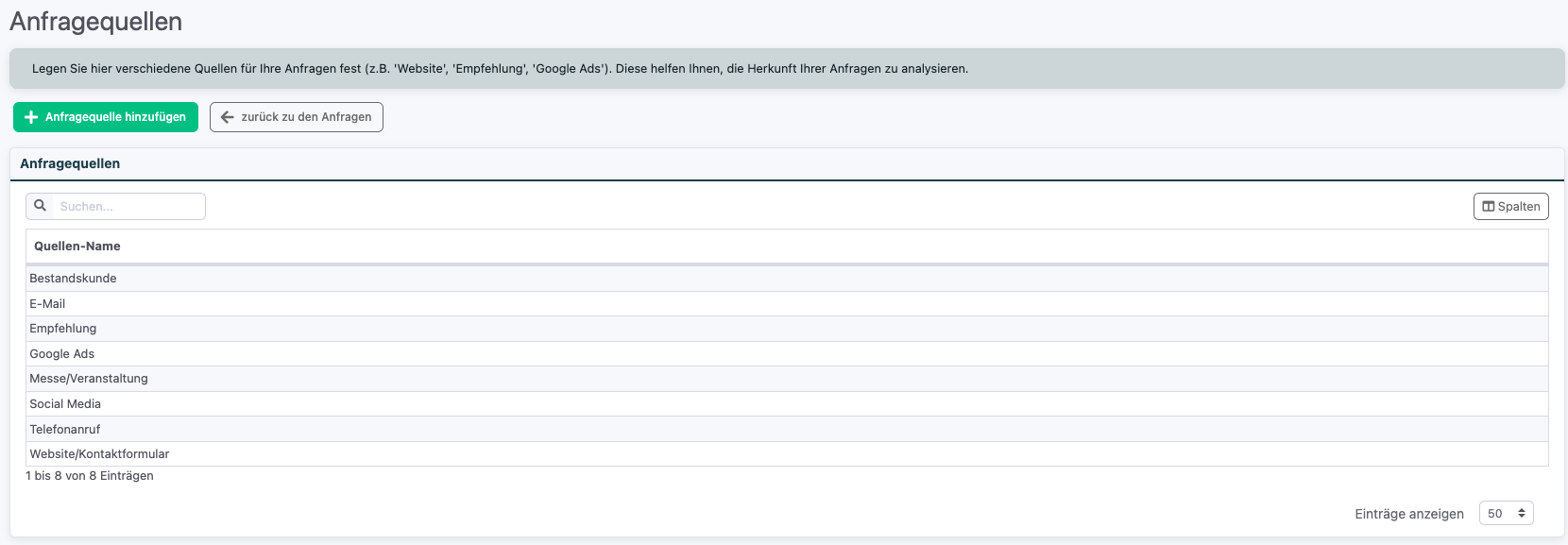 Jeder Anfrage können Sie eine Quelle zuordnen. Dies ermöglicht Ihnen später die Auswertung, welche Marketing-Kanäle am erfolgreichsten sind.