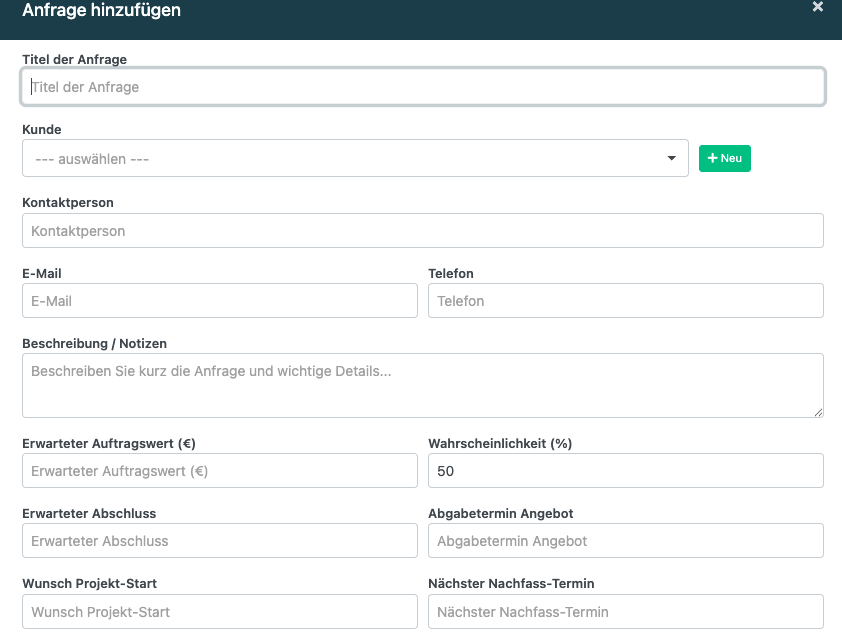 Die Erinnerungen sind direkt mit dem eingetragenen Datum verknüpft. Wenn Sie keine Erinnerungen wünschen, lassen Sie das Feld "Abgabetermin Angebot" einfach leer. Alternativ können Sie die Anfrage als gewonnen oder verloren markieren.