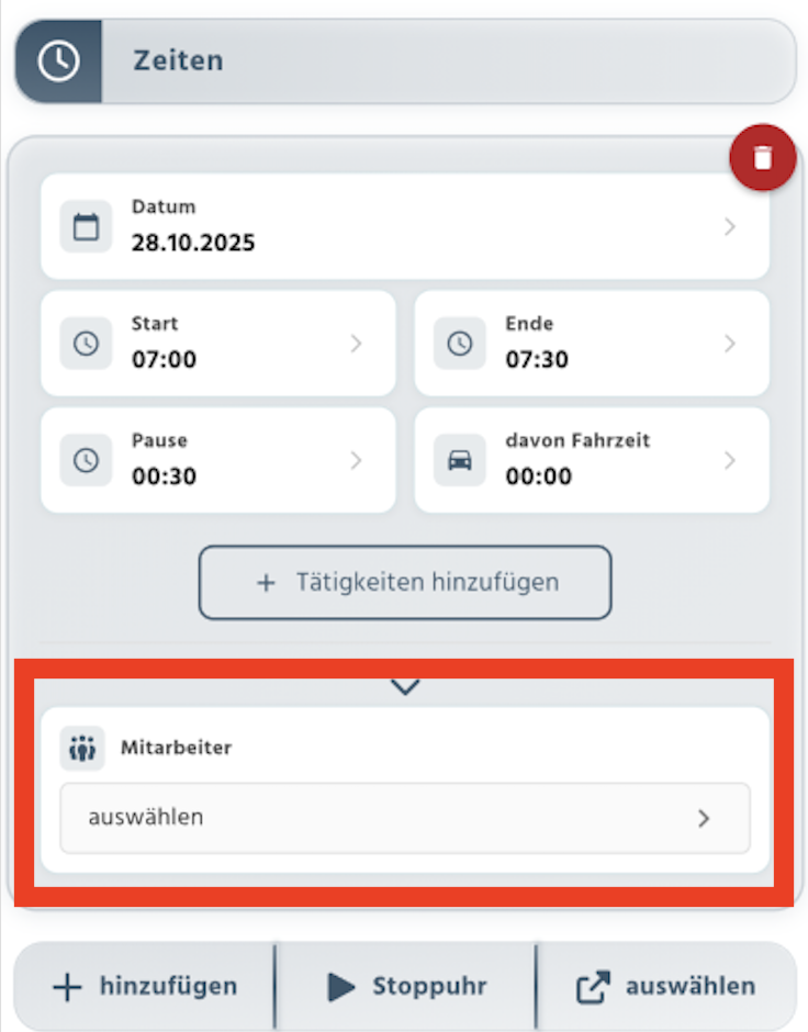 Archivierte Mitarbeiter werden in der Auswahl nicht angezeigt. Wenn sie in einem bestehenden Eintrag bereits zugeordnet sind, bleiben sie bei der Bearbeitung sichtbar, können aber nicht zu neuen Einträgen hinzugefügt werden.