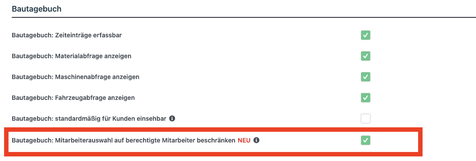 - Aktivieren Sie die Option "Bautagebuch: Mitarbeiterauswahl auf berechtigte Mitarbeiter beschränken"