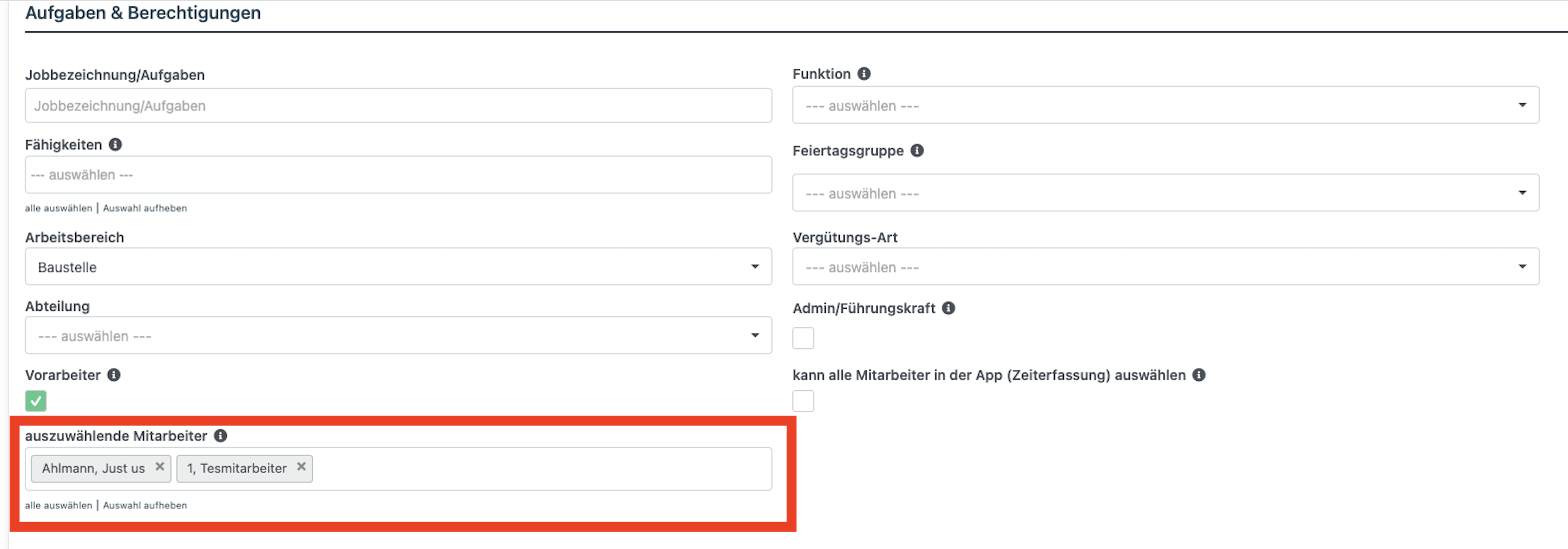 - Im Bereich Aufgaben & Berechtigungen können Sie die berechtigten Mitarbeiter zuordnen unter dem Punkt "auszuwählende Mitarbeiter"