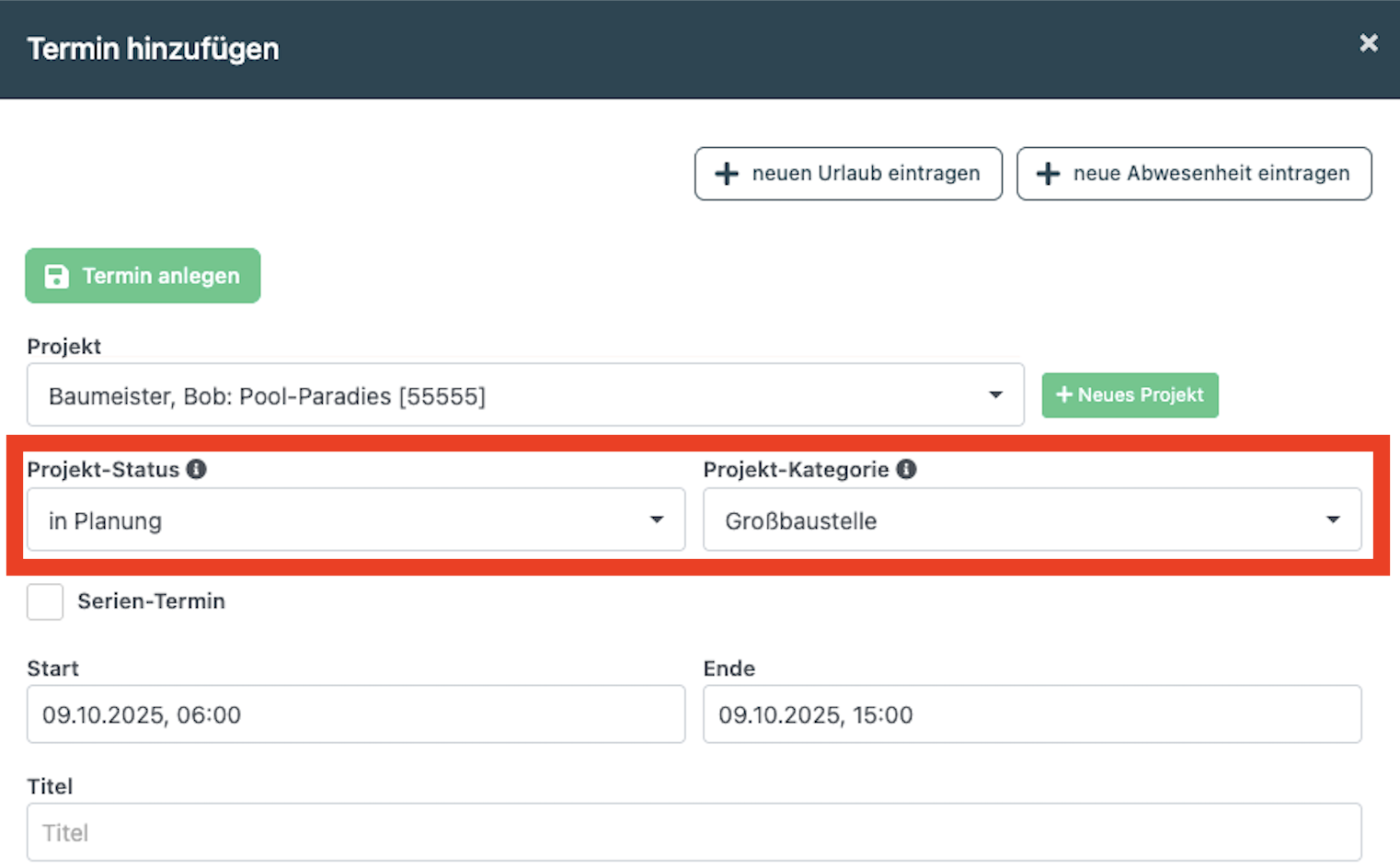 Diese Funktion bezieht sich nur auf die Erstellung von neuen Terminen und Zeiteinträgen. Bei der Bearbeitung bestehender Einträge erscheinen diese Felder nicht. Status und Kategorien können dann über die Projektdetails geändert werden.