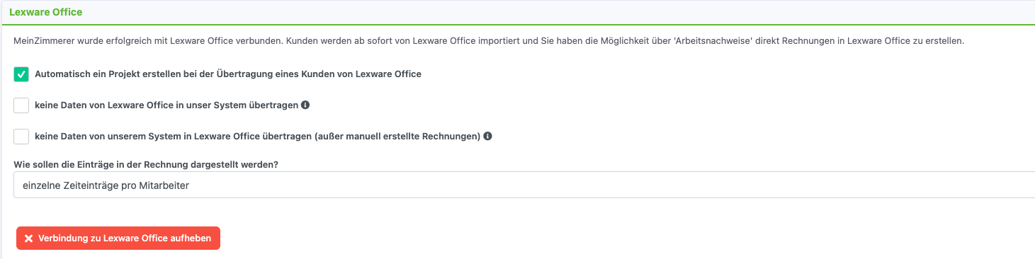 - Verbindung aufheben: Trennt die komplette Verbindung zu Lexware Office. Alle Funktionen (inklusive manuelle Rechnungserstellung) sind dann nicht mehr verfügbar