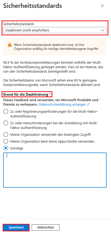 Bedenken Sie: Die "Sicherheitsstandards" sind eine zusätzliche Schutzmaßnahme von Microsoft. Durch das Deaktivieren entfernen Sie diesen zusätzlichen Schutz.