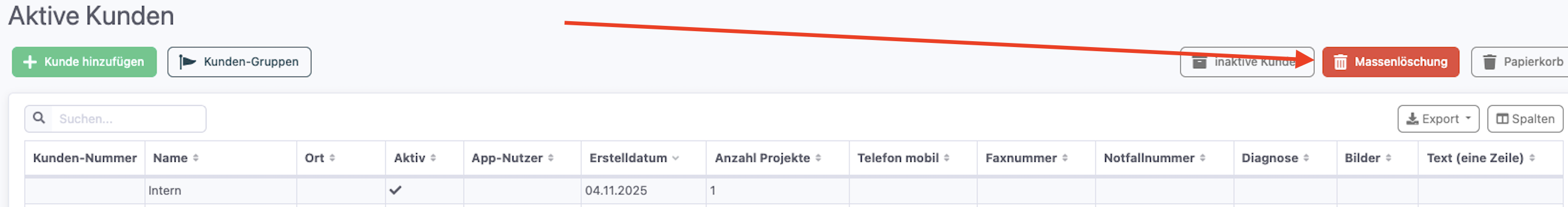 Aktuell ist die Massenlöschung nur für Kunden verfügbar. Weitere Datentypen können bei Bedarf ergänzt werden.