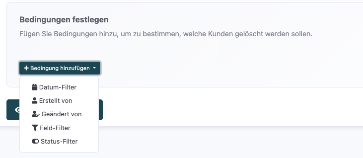 Sie können beliebig viele Filter kombinieren. Alle Bedingungen werden mit UND verknüpft, d.h. ein Kunde muss alle Bedingungen erfüllen, um gelöscht zu werden.