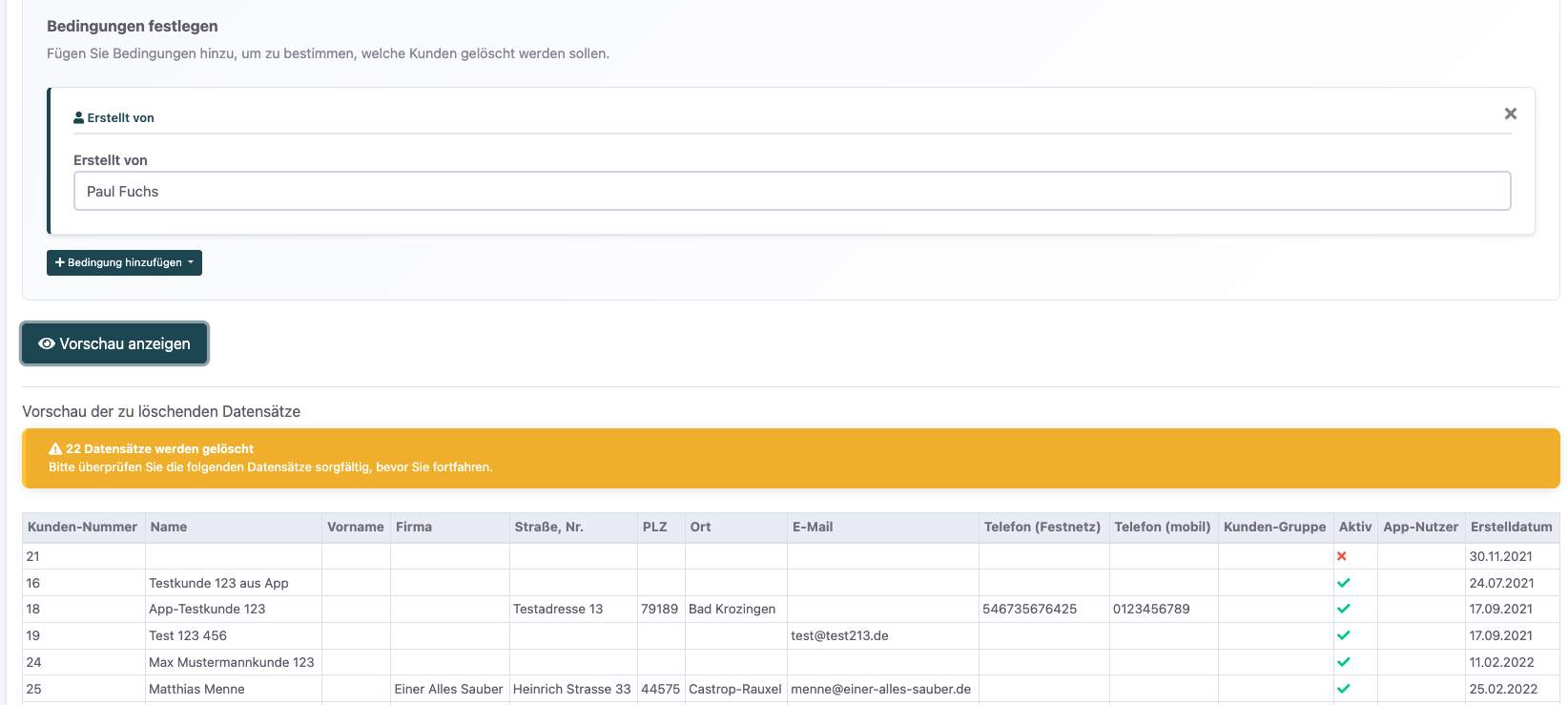 Klicken Sie auf Vorschau anzeigen, um zu sehen, welche Kunden gelöscht werden würden. Das System zeigt Ihnen: