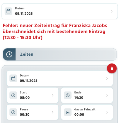 - Erhalten Ihre Mitarbeiter in der App keine Fehlermeldung mehr bei überlappenden Zeiteinträgen