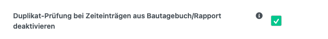 Wichtig: Die manuelle Zeiterfassung (ohne Bautagebuch/Rapport) prüft weiterhin auf Duplikate, sofern Sie diese nicht separat in den Zeiterfassungs-Einstellungen angepasst haben.