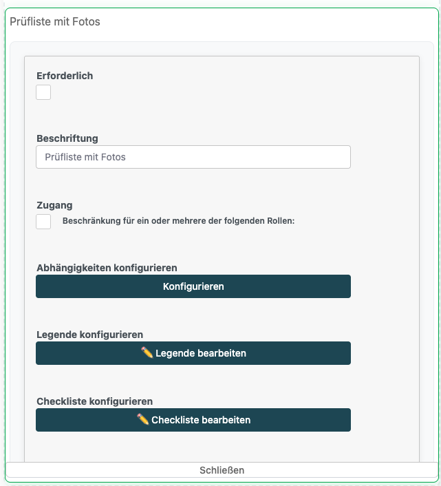 Mit dem Element "Prüfliste mit Fotos" können Sie im Konfigurator strukturierte Checklisten erstellen, bei denen Prüfpunkte mit Fotos verknüpft werden können. Besonders geeignet für Inspektionen, Abnahmen und Dokumentationen, bei denen Befunde visuell belegt werden müssen.