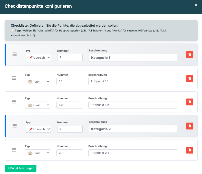 Klicken Sie auf "Checkliste bearbeiten", um Ihre Prüfpunkte anzulegen. Sie können zwei Arten von Einträgen erstellen: