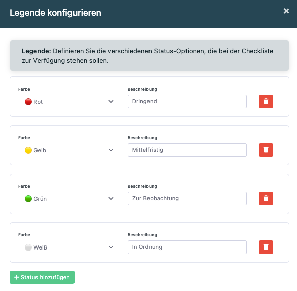 - Bezeichnung: Was diese Farbe bedeutet (z.B. "Mangel festgestellt")