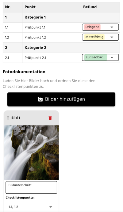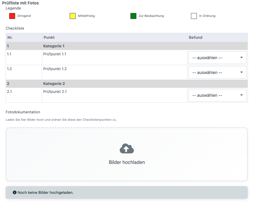 - Fotobereich: Hier können Fotos hochgeladen und den Prüfpunkten zugeordnet werden