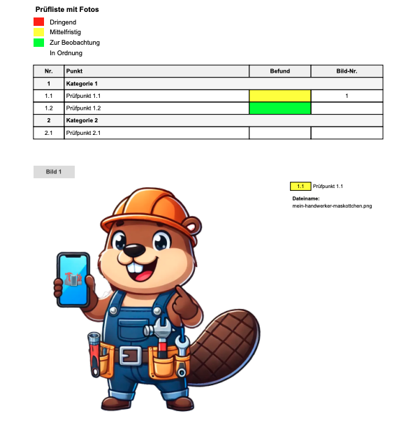 - Fotodokumentation mit Bildern, Beschreibungen und Verknüpfung zu den Prüfpunkten