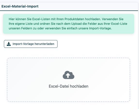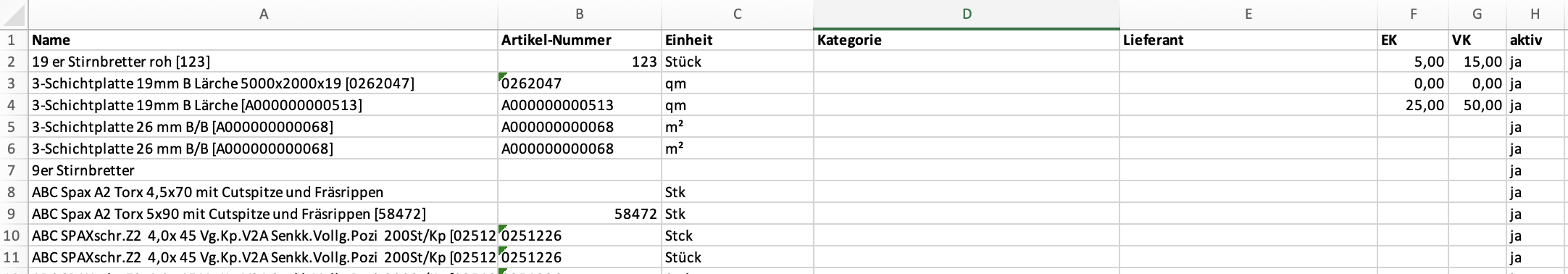 Exportieren Sie zuerst Ihre bestehenden Materialien und bearbeiten Sie diese Datei. So bleiben Name und Artikelnummer erhalten und das System erkennt die Materialien beim Import wieder.