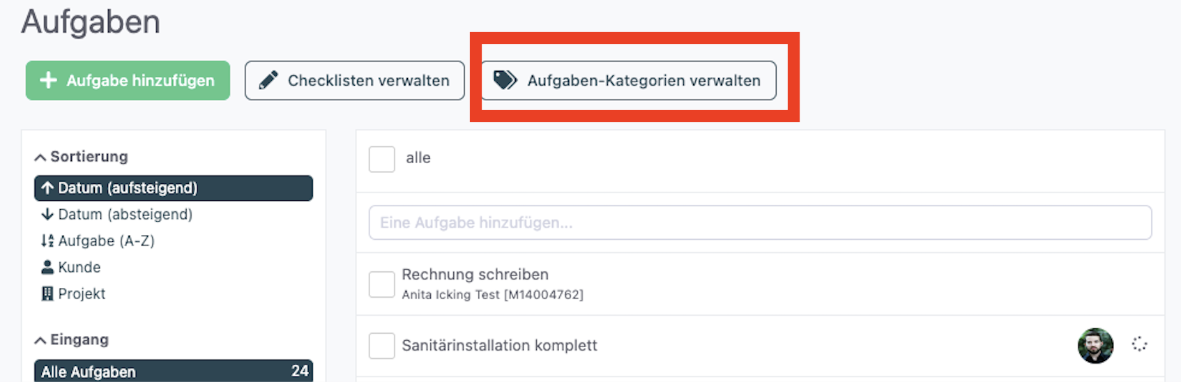 Die Liste zeigt dann nur Aufgaben der ausgewählten Kategorie an. Neben jeder Kategorie wird die Anzahl der offenen Aufgaben in dieser Kategorie angezeigt.