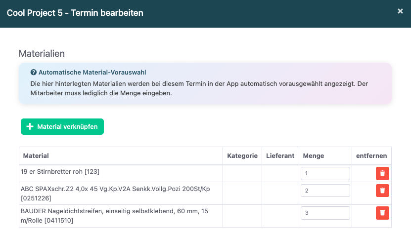 Die Materialien erscheinen dann bereits als Einträge im Formular. Der Mitarbeiter muss nur noch die Mengen anpassen oder nicht benötigte Materialien entfernen. Die Termin-Materialien werden zusätzlich zu den Materialien angezeigt, die bereits mit dem Projekt oder der Projektkategorie verknüpft sind.