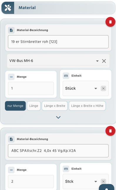 Ja, der Mitarbeiter kann die Mengen anpassen, Materialien entfernen oder weitere Materialien manuell hinzufügen.