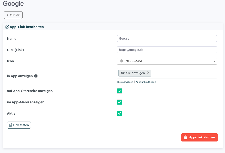 Aktiv: Nur aktive Links werden in der App angezeigt.