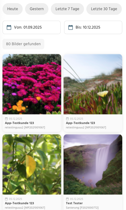 Mit der Bilder-Übersicht sehen Sie alle Fotos aus allen Projekten zentral auf einer Seite. Sie können nach Datum filtern und alle Bilder eines Zeitraums als ZIP-Datei herunterladen.