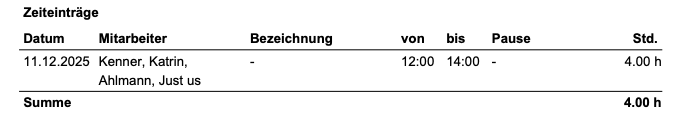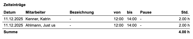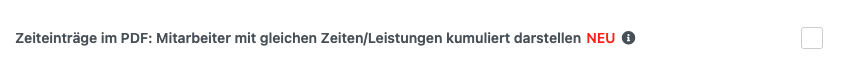Diese Einstellung ermöglicht eine kompaktere Darstellung von Zeiteinträgen im PDF-Export. Wenn mehrere Mitarbeiter zur gleichen Zeit dieselben Tätigkeiten ausgeführt haben, werden diese zusammengefasst angezeigt.