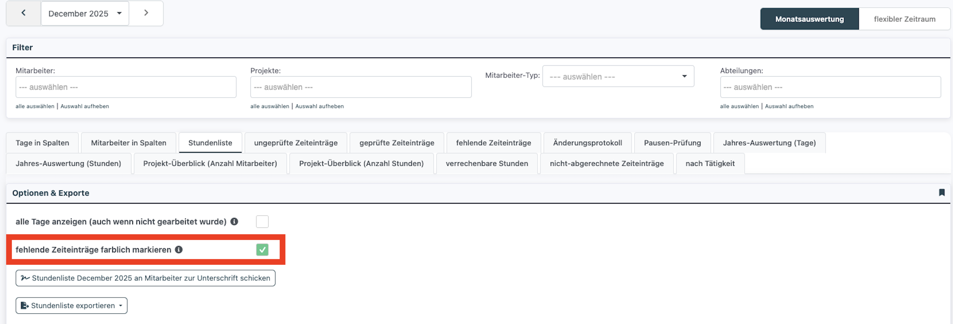 Die Option befindet sich im Tab "Stundenliste" der Monatsauswertung im Bereich "Optionen & Exporte". Stellen Sie sicher, dass Sie die entsprechenden Berechtigungen für die Zeiterfassung haben.