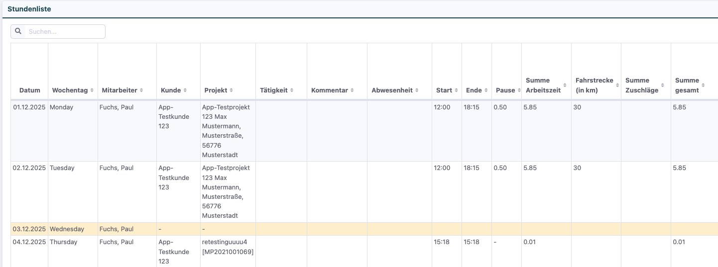 Mit dieser Funktion erkennen Sie auf einen Blick, bei welchen Mitarbeitern Zeiteinträge fehlen. Arbeitstage ohne erfasste Zeiten werden farblich (orange) hervorgehoben - so sparen Sie Zeit bei der täglichen Kontrolle der Stundenlisten.