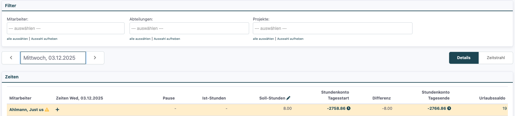 Wenn die Option aktiviert ist, werden auch in der täglichen Zeiterfassungsübersicht Mitarbeiter ohne Zeiteintrag orange hinterlegt. Zusätzlich erscheint ein Warnsymbol neben dem Mitarbeiternamen mit dem Hinweis "Mitarbeiter hat trotz Soll-Zeit keine Zeiten erfasst".