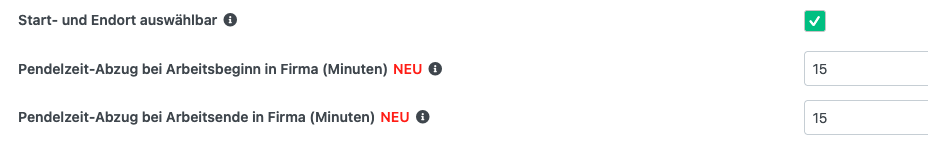 Um diese Funktion nutzen zu können, muss zuerst die Option Start- und Endort auswählbar aktiviert sein. Erst dann erscheinen die Einstellungen für den Pendelzeit-Abzug.