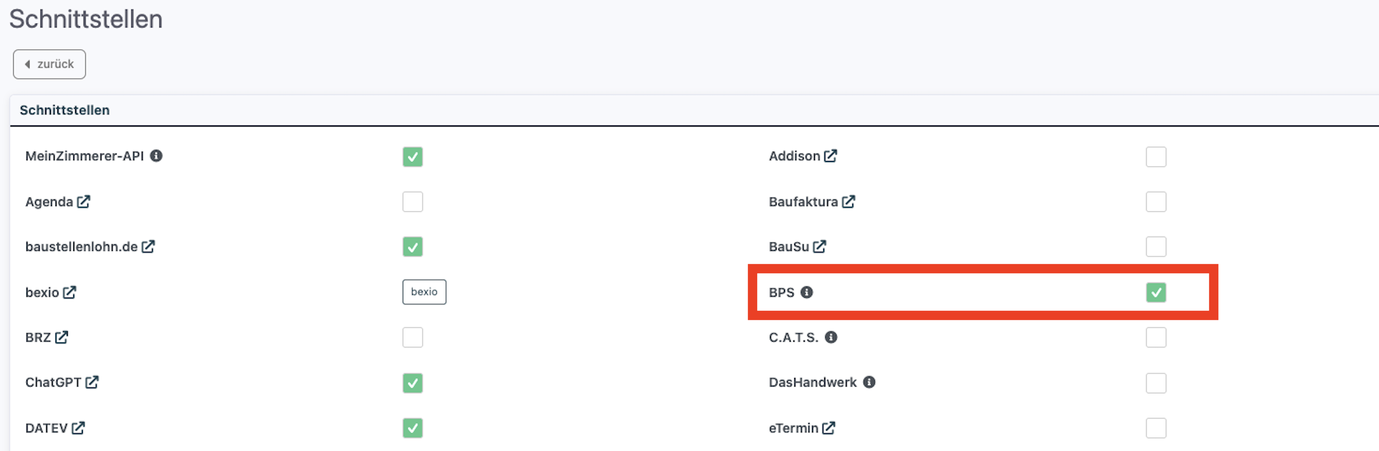 - Gehen Sie im System zu Admin > Schnittstellen > BPS-Schnittstelle