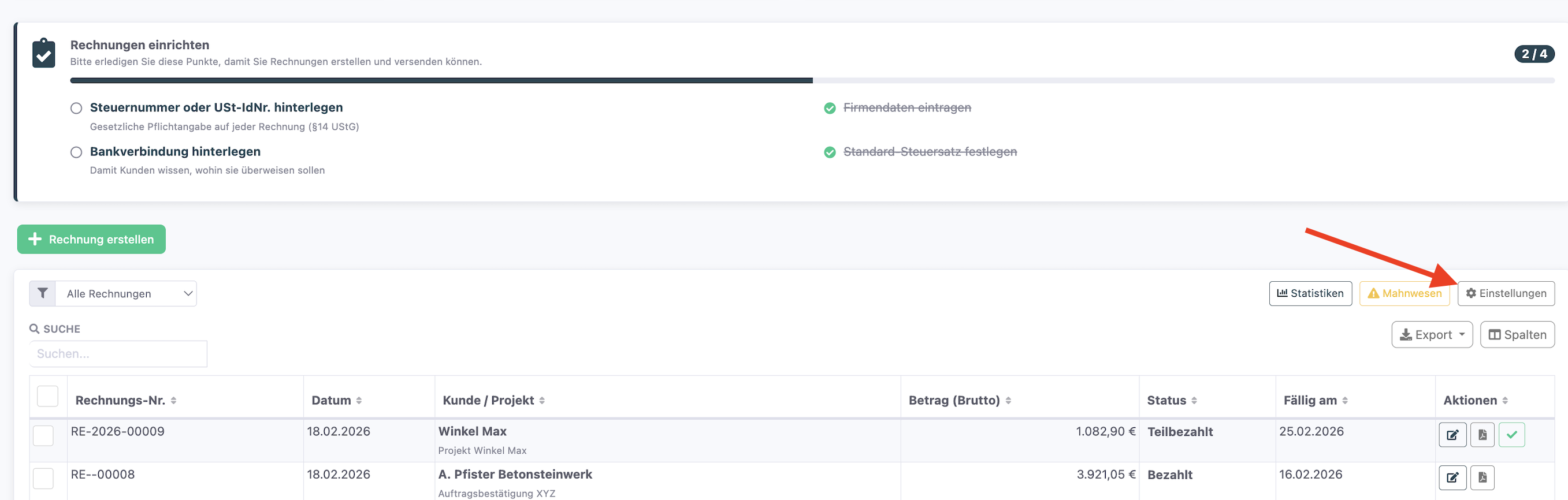 Sie finden alle diese Einstellungen unter Einstellungen (Zahnrad-Symbol oben rechts in der Rechnungsübersicht).