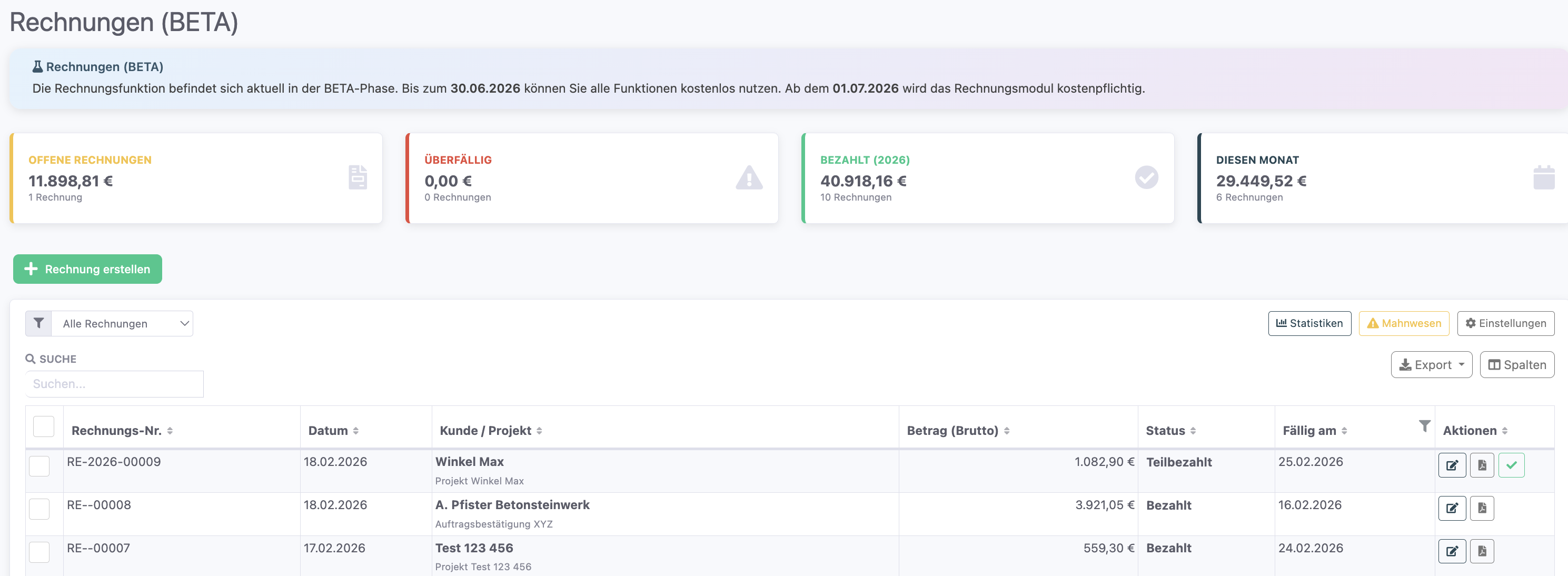 • Mahnwesen (Ausrufezeichen-Symbol): Übersicht aller mahnenswerten Rechnungen. Dieser Button erscheint nur, wenn das Mahnwesen in den Einstellungen aktiviert ist.