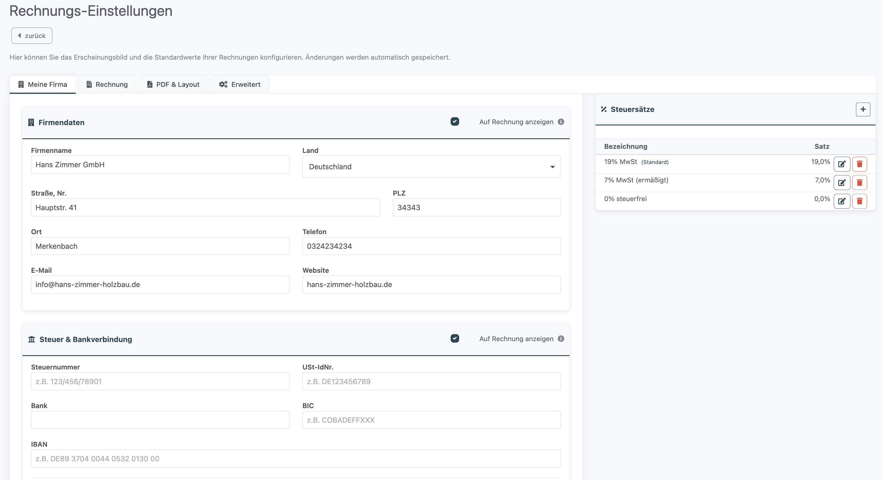 Hier hinterlegen Sie die Daten, die auf jeder Rechnung erscheinen.