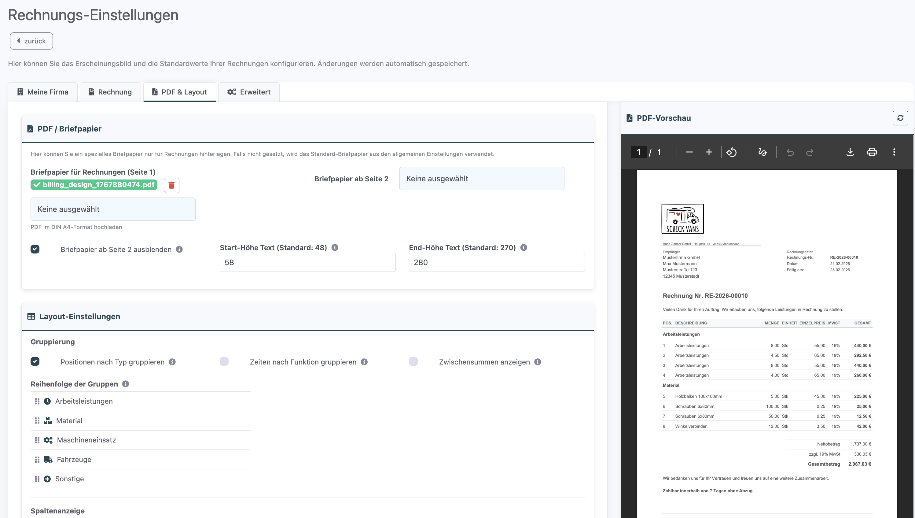 In der rechten Seitenleiste (bei Tab 3 und 4) sehen Sie eine Live-Vorschau Ihrer Rechnung mit Beispieldaten. Änderungen an den Einstellungen werden sofort in der Vorschau sichtbar, sodass Sie das Ergebnis direkt kontrollieren können.