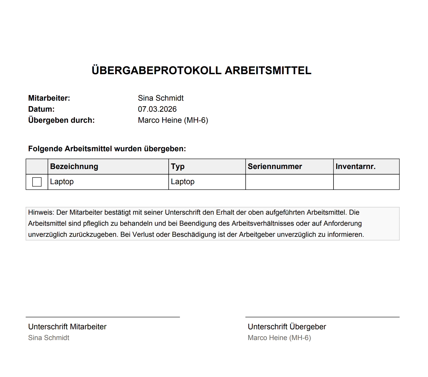 - Arbeitsmittel zuordnen: Gegenstände an Mitarbeiter vergeben, Rückgaben dokumentieren und Übergabeprotokolle erstellen