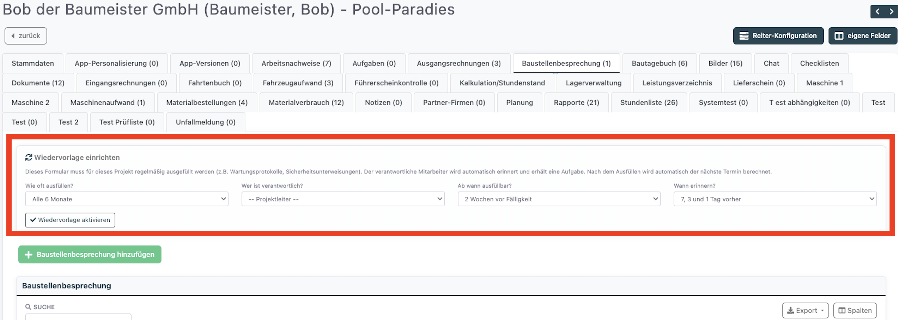 Mit der Wiedervorlage-Funktion können Sie eigene Formulare so einrichten, dass sie regelmäßig ausgefüllt werden müssen – zum Beispiel Wartungsprotokolle für ein bestimmtes Fahrzeug oder Sicherheitsunterweisungen für ein Projekt. Das System erinnert den verantwortlichen Mitarbeiter automatisch und erstellt eine Aufgabe, wenn das Formular fällig ist.