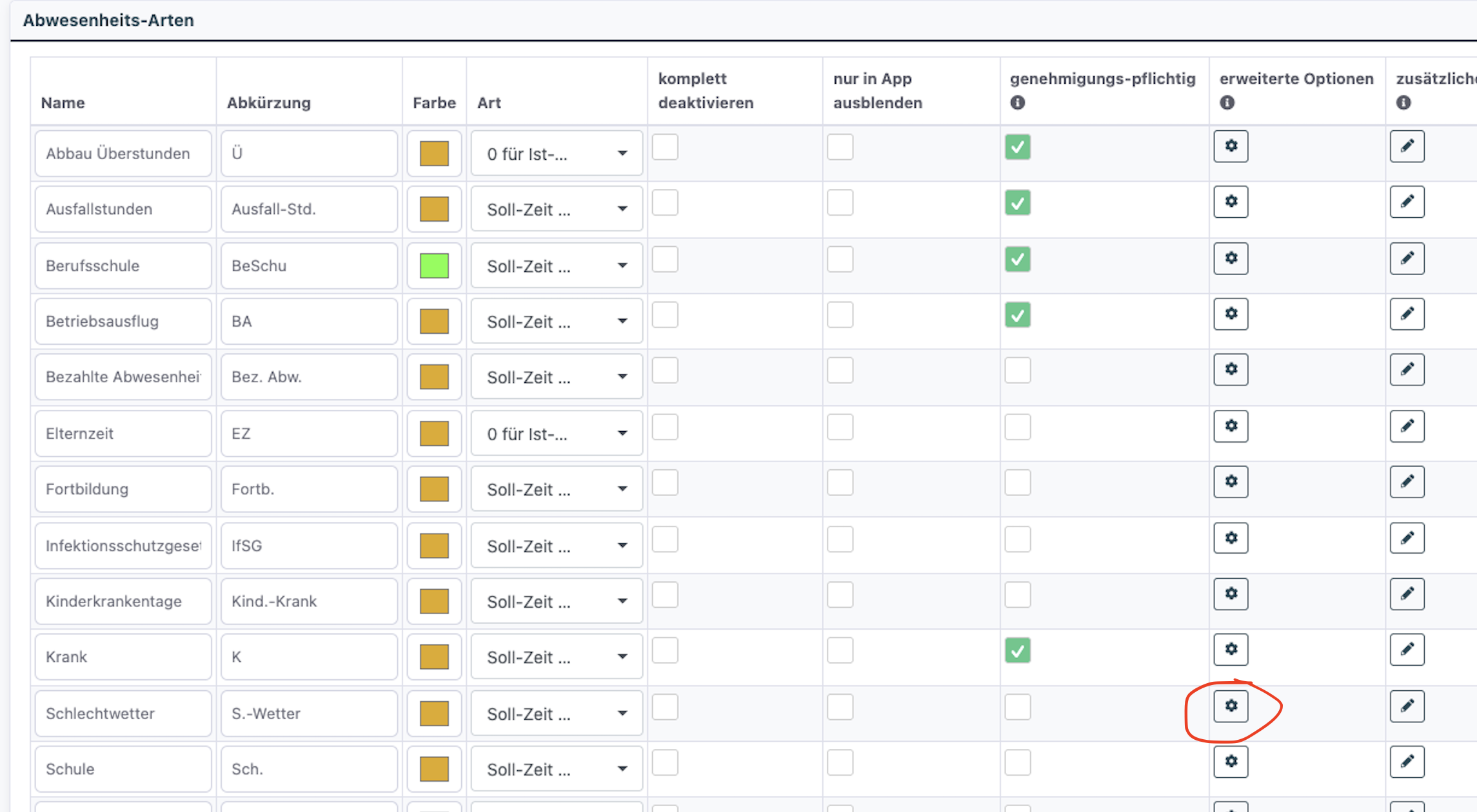 - Wählen Sie in der Liste den Abwesenheitstyp Schlechtwetter und klicken Sie auf bearbeiten.