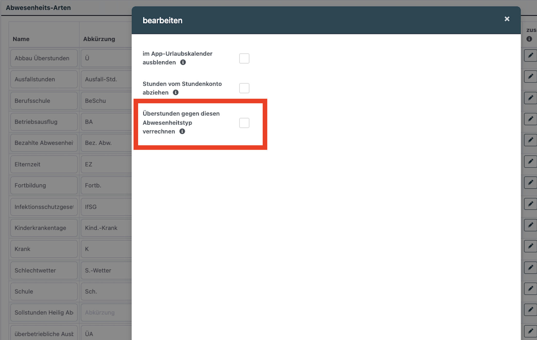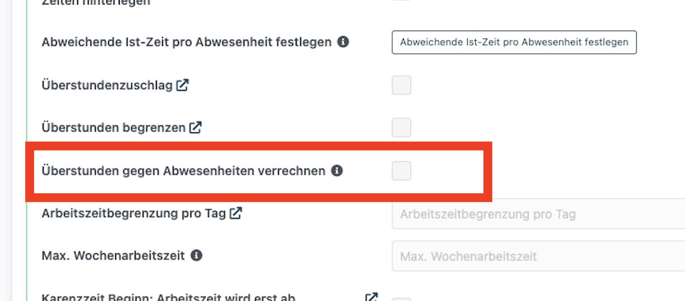 - Setzen Sie den Haken bei Überstunden gegen Abwesenheiten verrechnen.